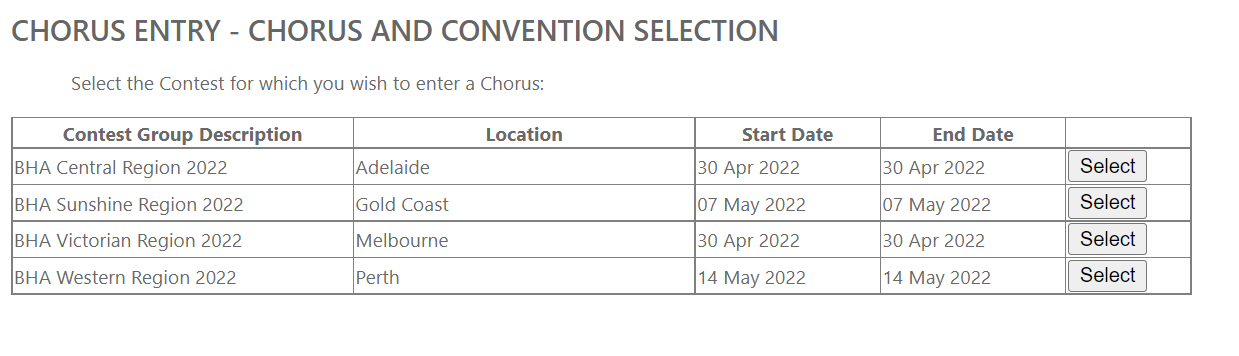 After the chorus representative has confirmed their contact details, the next step in the entry process is to select the correct Contest Group ie a regional contest, a regional video contest or a national convention.