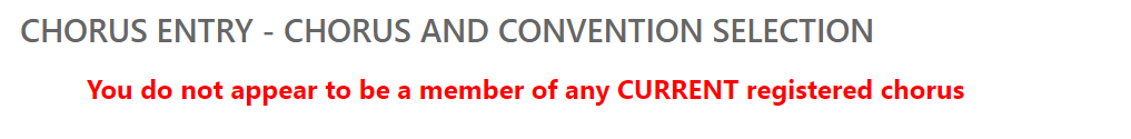 Having selected the correct Contest Group, you will be given a list of the choruses, if any, of which you are a member.  If you are not a member of (or affiliated with) any chorus, you will get an error: