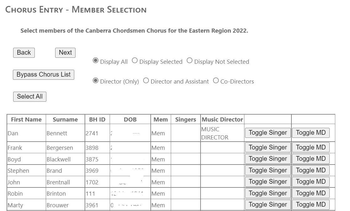 To select or de-select a singer, click on the Toggle Singer button.  All the current BHA or BHNZ members may be selected together by clicking on the Select All button.