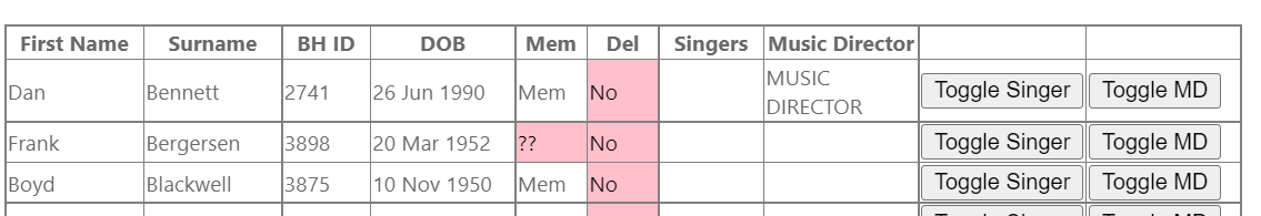 The display shows whether the chorus member is also a member of either BHA or BHNZ as indicated in the "Mem" column.  If the chorus member is not active in the parent organisation, the value in the Mem column is "No" and backgrounded in pink.  Some conventions require that all singers are registered delegates.  If this is the case, the display of the chorus members may have an extra column showing whether or they are a registered delegate.  Those who are not registered as a delegate have "No" next to their names backgrounded in pink.