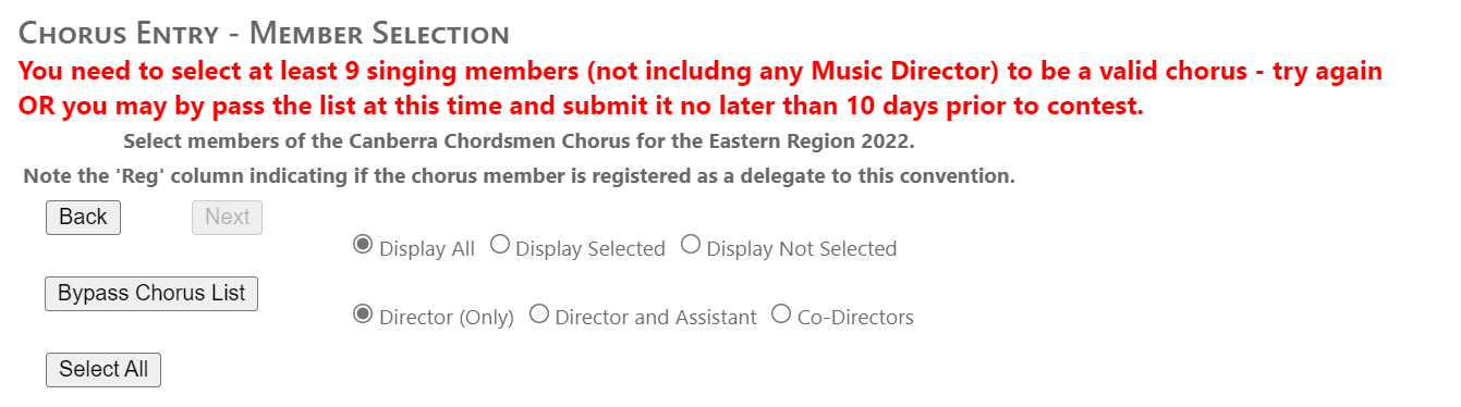If, on the hand, the Director(s) and sufficient members of hte chorus could be selected, clicking on Next will take you to the specific Contest Selection page.  (Clicking on the Bypass Chorus List button may take you straight to the specific Contest Selection page if the contest organisers do not need an early indication of chorus sizes and have not requested the contest entry system ask for it).