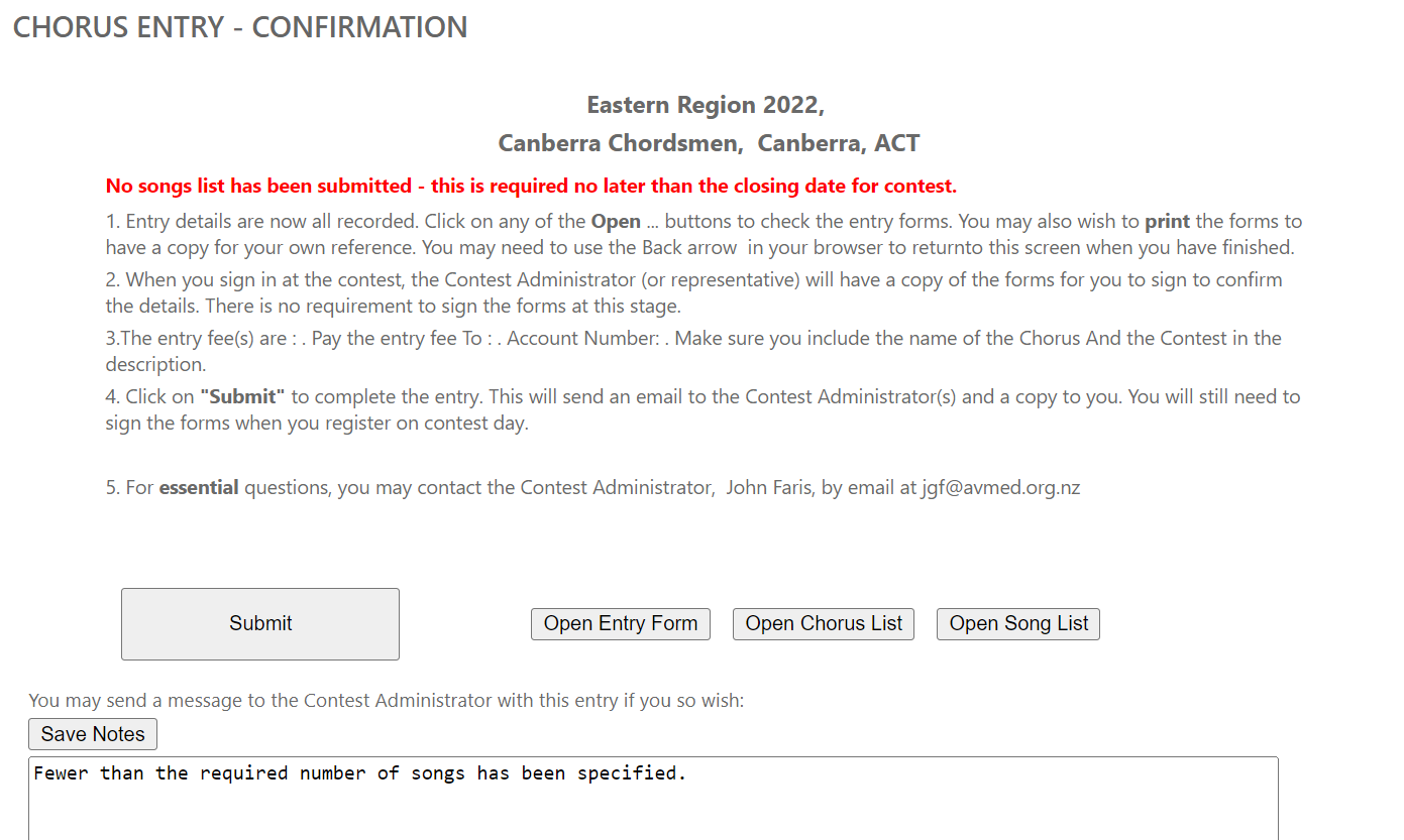 The first thing to note in this case, is the line in red at the top of the screen reminding you that a song list has not yet been submitted. The same message is included in a box at the bottom of the screen which is a note that is sent electronically to the CA. You can modify this note or add to it if there is a message you wish to send, eg a request to sing earlier or later in the contest and the reasons for the request, etc... If you do put in a note (or modify a note such as the one already given by the system in this case), click on the Save Notes button to do so.