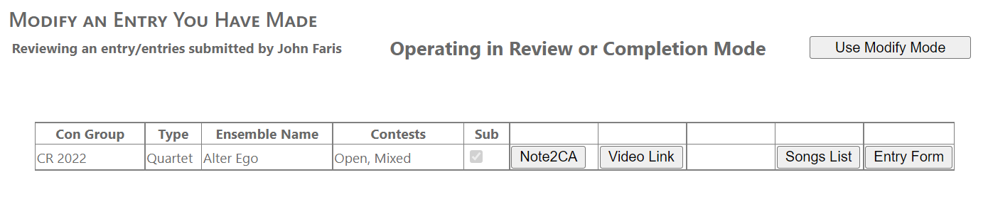 Clicking on "Use Modify Mode" will allow a Songs List, a Chorus List or a by-passed Quartet membership to be completed. For the entry in this example, clicking this button changes the display to the following: