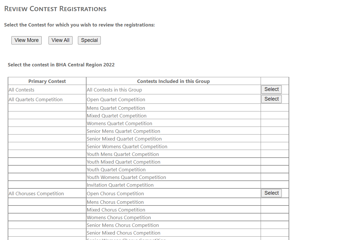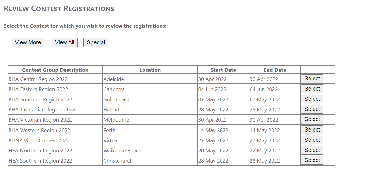 The standard display is only for contests that are still open for entries. View More goes back 6 months and View All goes back through the whole system. Special is only available for root CAs and gives access to all registrations even if they were not progressed to the point of a contest group and contest being selected.