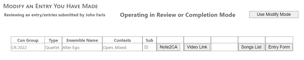 •Review Entry - goes to the standard review or modify entry screen for this ensemble - refer to Modify or Review Entries Help