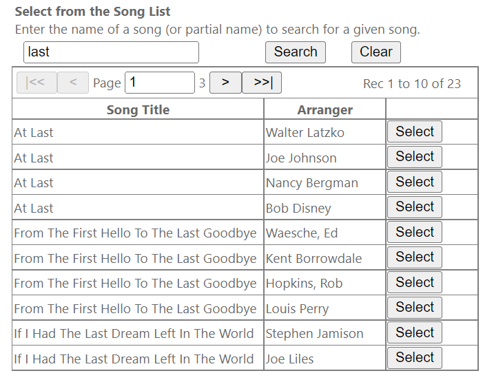 Allternatively, a song title or partial song title can be entered into the search box on the right. Click Search and a list of songs matching the title will be displayed: