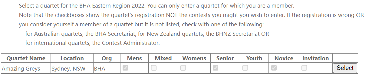 On the other hand, if you are a member of any quartet, you will get a list of the quartets of which you are a member and you can select one of these by clicking on the appropriate Select button: