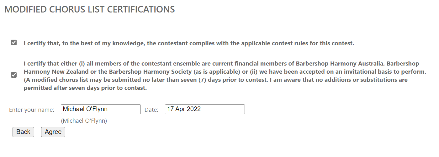 Having clicked on the Submit button, you are taken to a declaration and signature screen similar to that when submitting an entry but obviously much shorter.