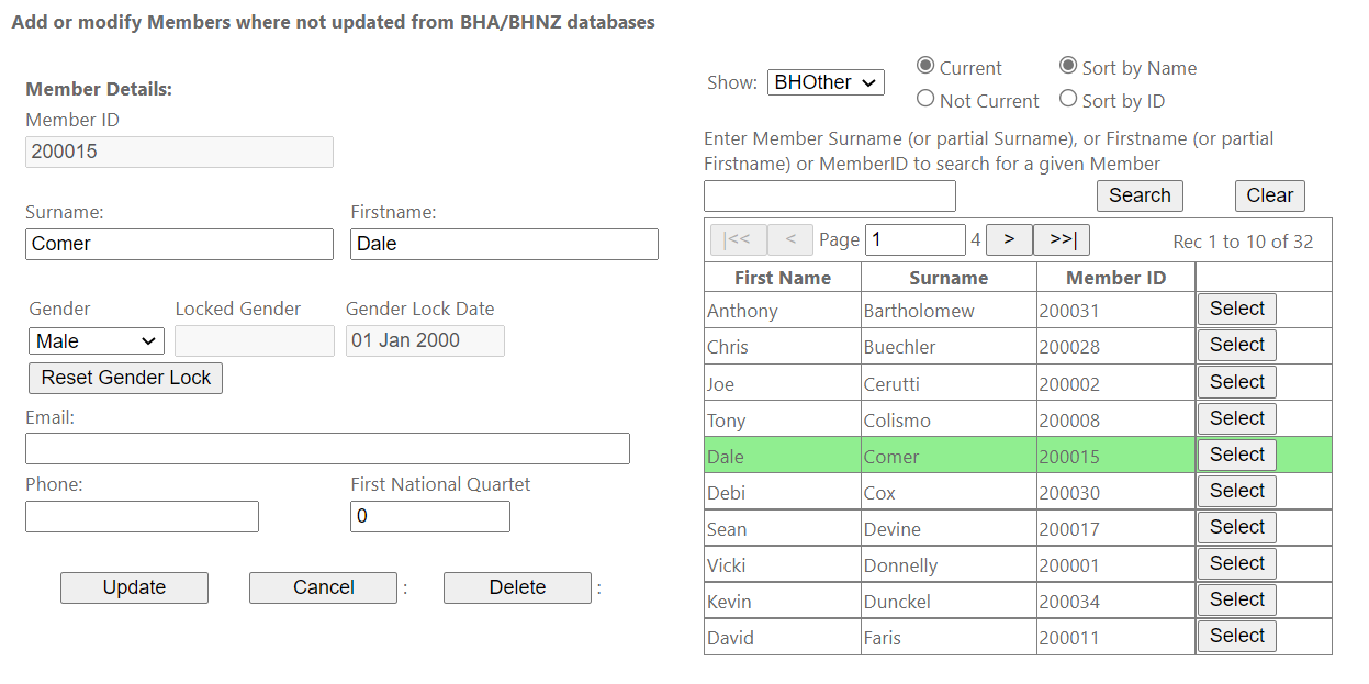 The Locked Gender field is set on the first occasion in any calendar year on which the member is a member of a quartet or chorus entered into a contest.  The gender lock date will also be set with the date of this entry.  Even if the member changes their gender in the BHA or BHNZ database during the rest of the calendar year, in accordance with the contest rules of both countries, the gender is locked as it was with that first contest entry.  For example: