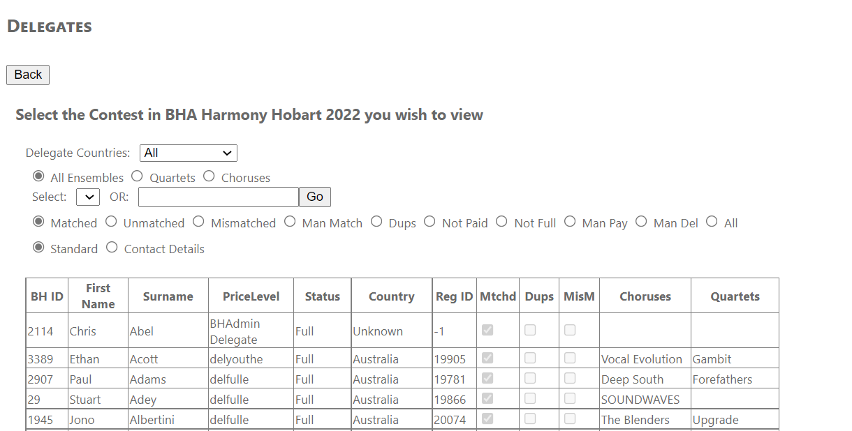 The main view and control of delegates is available in BHAdmin.  The contests website allows viewing only.  First select the national convention - normally the regionals would be well past and not show: