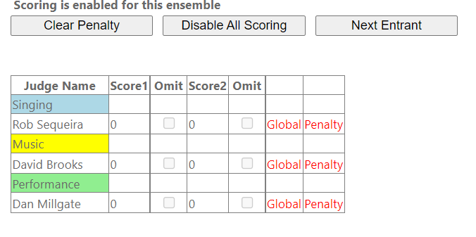 If a penalty has been applied to an entrant or just to a song, the ADM Judge can clear the penalty by clicking on the Enable/Disable this Scoring button which will instead read Clear Penalty. This is a one way action on the website and a penalty cannot be reapplied.