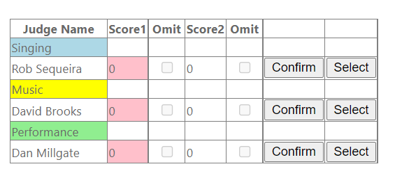 The ADM Judge can confirm a score for a scoring judge by clicking on the Confirm button next to the judges score. As has happened in this case, the score for the Music Judge has been confirmed so the button is replaced by text saying so.