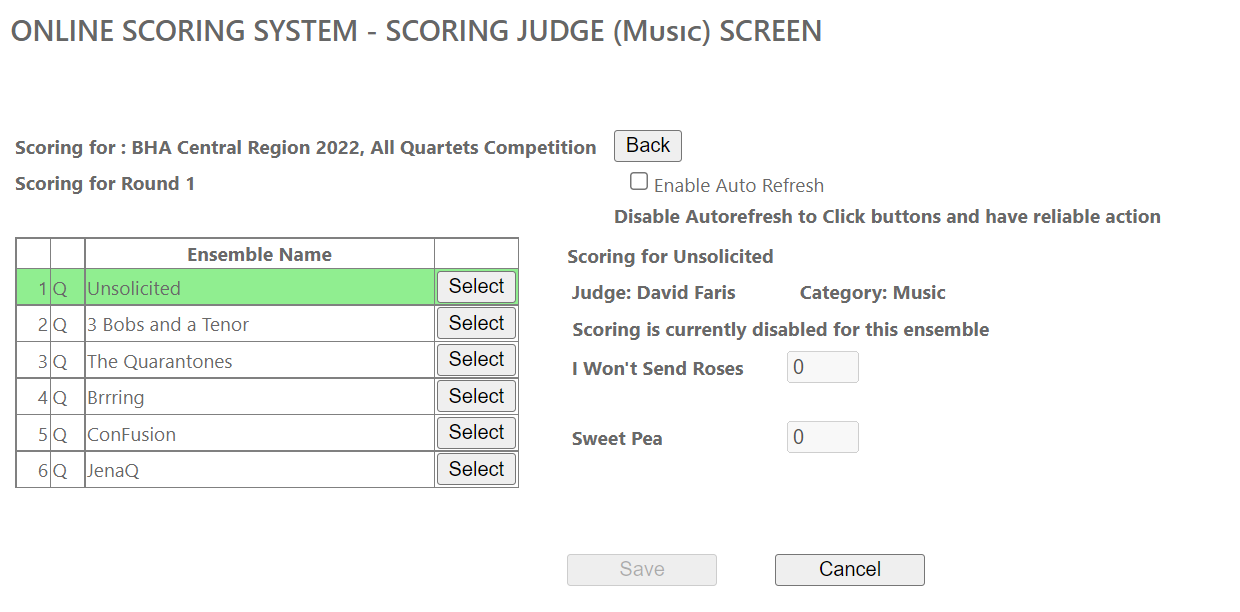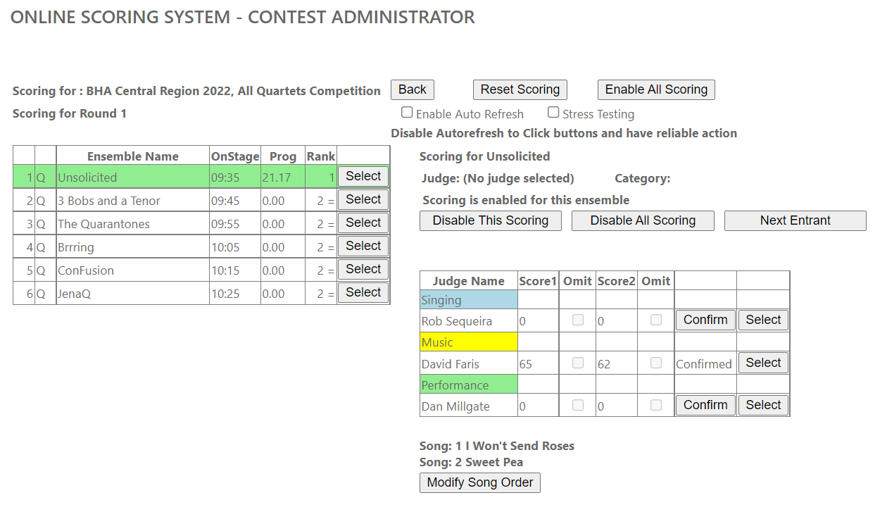 The display on the left has extra columns to show the time on stage, the scores as already entered and the rank at this point in the contest. The Reset Scoring and Enable Scoring buttons have effects on the whole round and have obvious actions. The Enable Autorefresh is particularly useful for the ADM Judge to monitor the scoring once the performance is complete. Ignore the Stress Testing check box as it is not available for most CAs (but allows multiple hits to be made on the website in short succession).